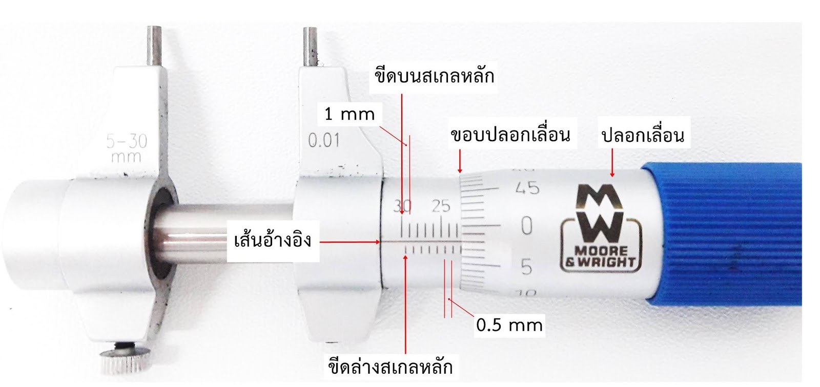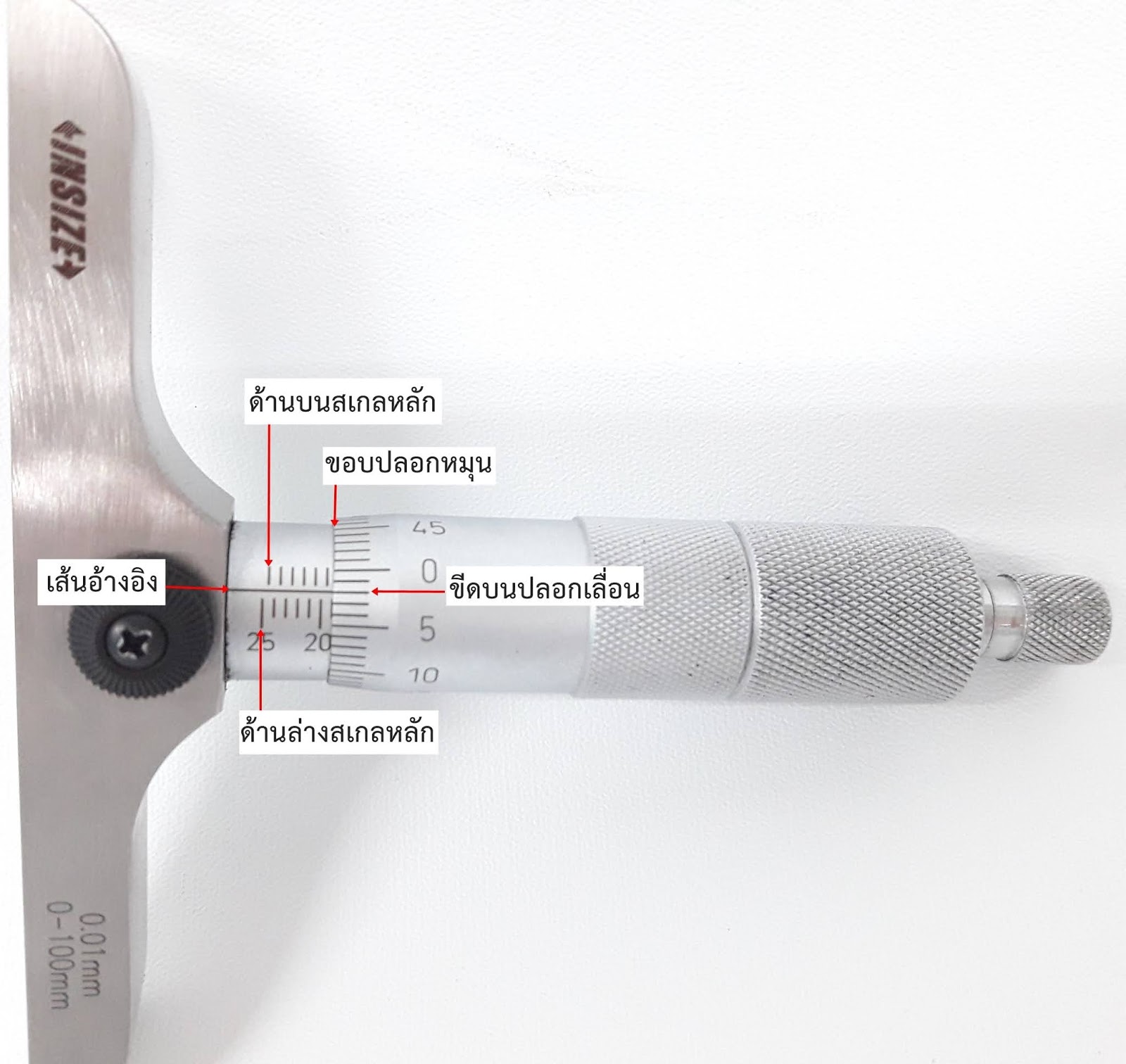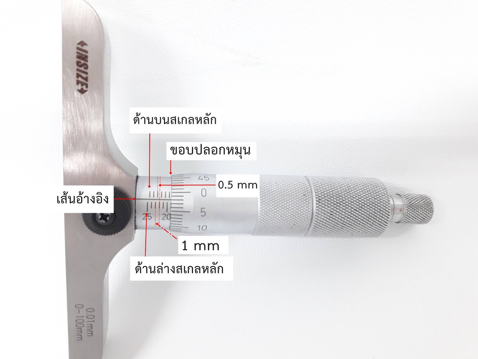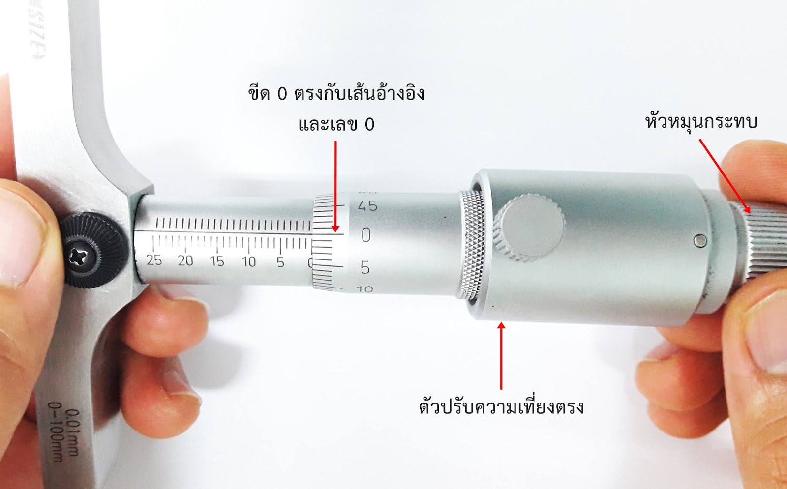 เลื่อนให้ตรงกับเส้นอ้างอิง ก่อนการใช้งาไมโครมิเตอร์ทุกครั้งควรมีการตรวจสอบความเที่ยงตรงของไมโครมิเตอร์ ถ้าพบว่าไม่ตรง
