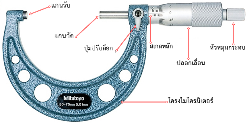 ไมโครมิเตอร์วัดนอกประกอบด้วยส่วนต่างๆ ดังนี้