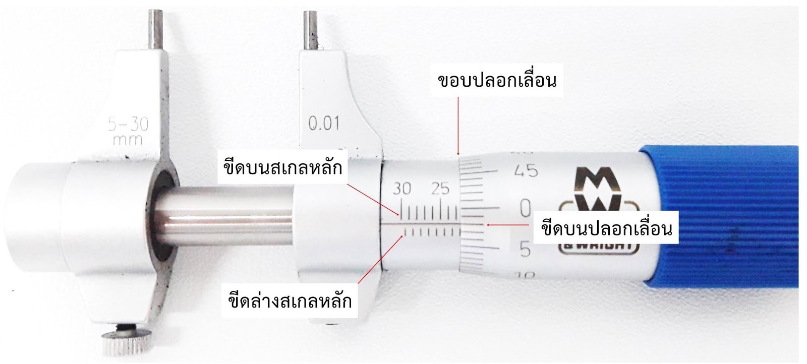 2.6 ปลอกเลื่อนหรือสเกลเลื่อนหรือปลอกหมุน (Thimble) ลักษณะเป็นทรงกระบอกสวมอยู่บนสเกลหลักสามารถเคลื่อนที่เข้า
