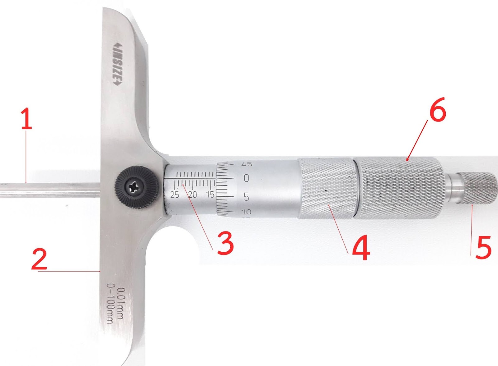 8.1 ก้านวัดลึก (Spindle) ลักษณะเป็นแกนวัด สามารถเปลี่ยนขนาดได้ตามความลึกของชิ้นงานโดยมีขนาดเริ่มจาก 0-25 mm, 25-50